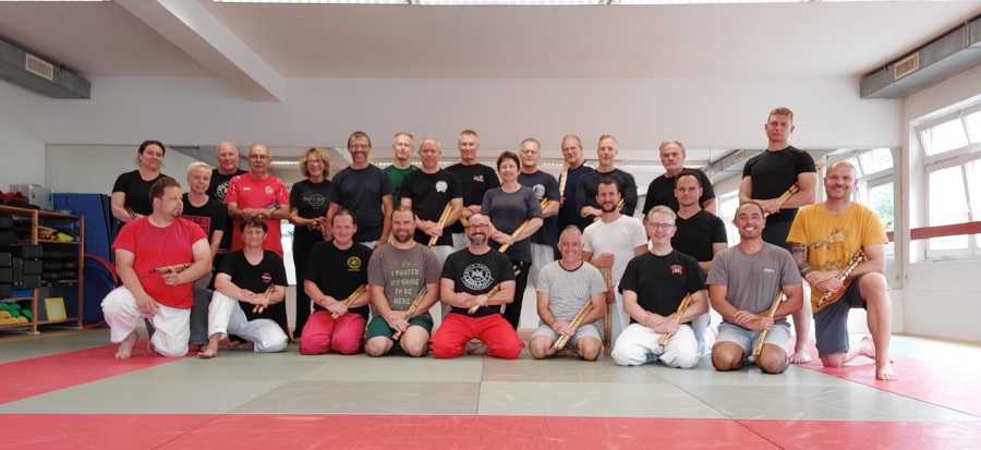 und Übungen für den Umgang mit dem Stock, dem Haupttrainingsgerät im Eskrima, los. Über drei Stunden lang wurden bei einer sehr angenehmen sportlichen, fast familiären Atmosphäre intensiv Abwehr- und